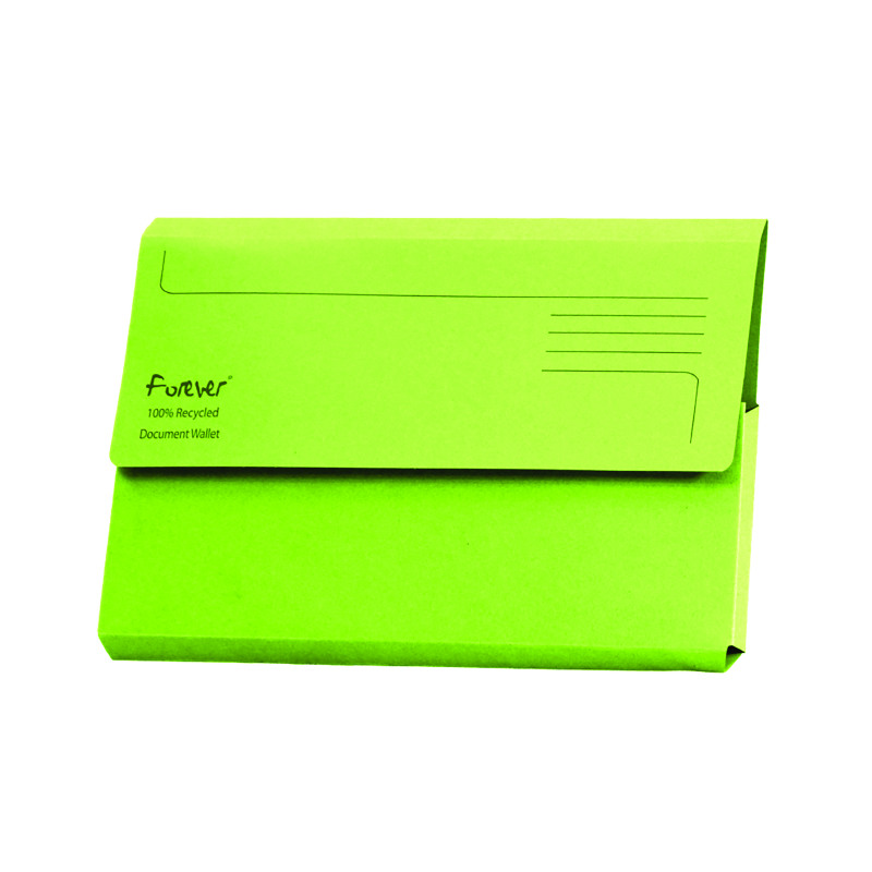 This environmentally friendly Forever document wallet is made from 100% recycled, 300gsm manilla. The folder features a 32mm gusset and can hold up to 180 sheets of A4 or foolscap paper. This pack contains 25 bright green foolscap document wallets, ideal for colour coordinated filing.