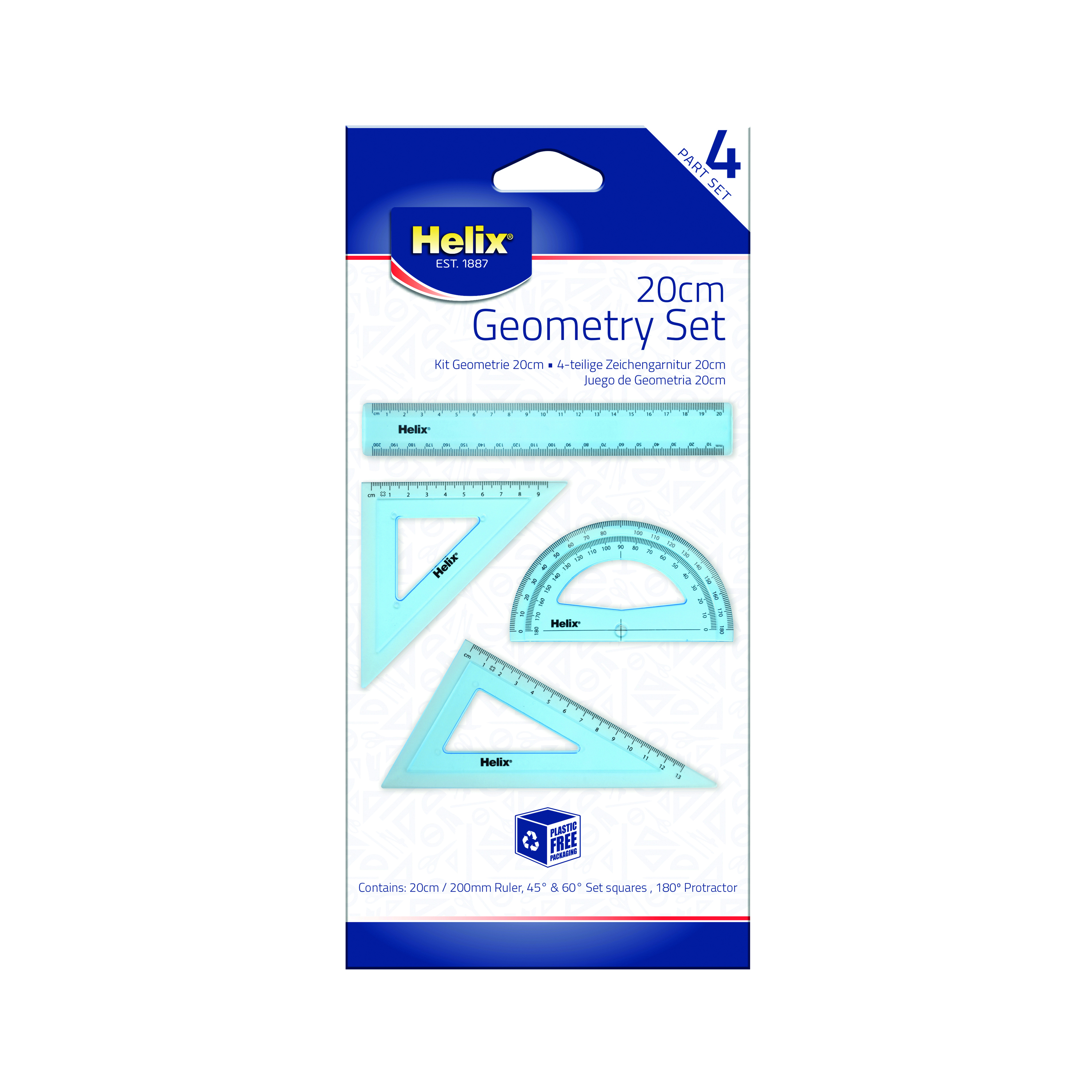 - Set includes: 20cm ruler, 45 and 60-degree set squares and 180-degree protractor
